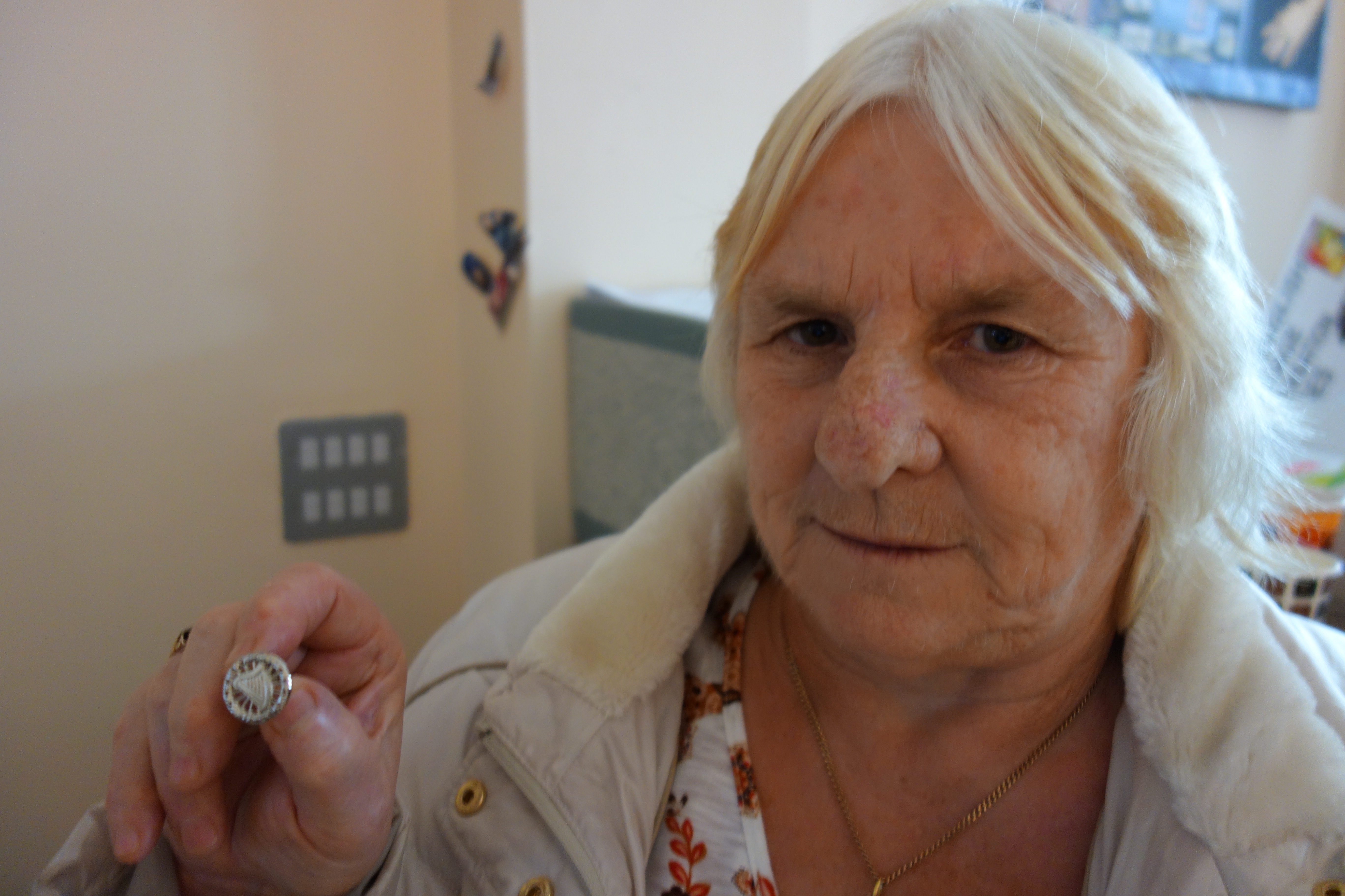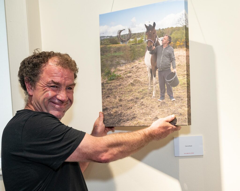 Francie Boyle with his photograph at the launch of the Donegal Traveller’s Project “Still Here Still Proud” Exhibition. Photo -Clive Wasson